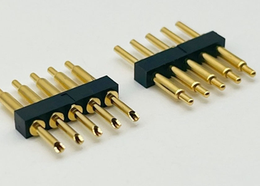 A distância entre os conectores Pogo Pin pode ser dividida em: 1,27 mm,2.0 mm,2.5 mm,2.54mm,3.0 mm,4.0 mm, materiais plásticos comumente utilizados PA46.